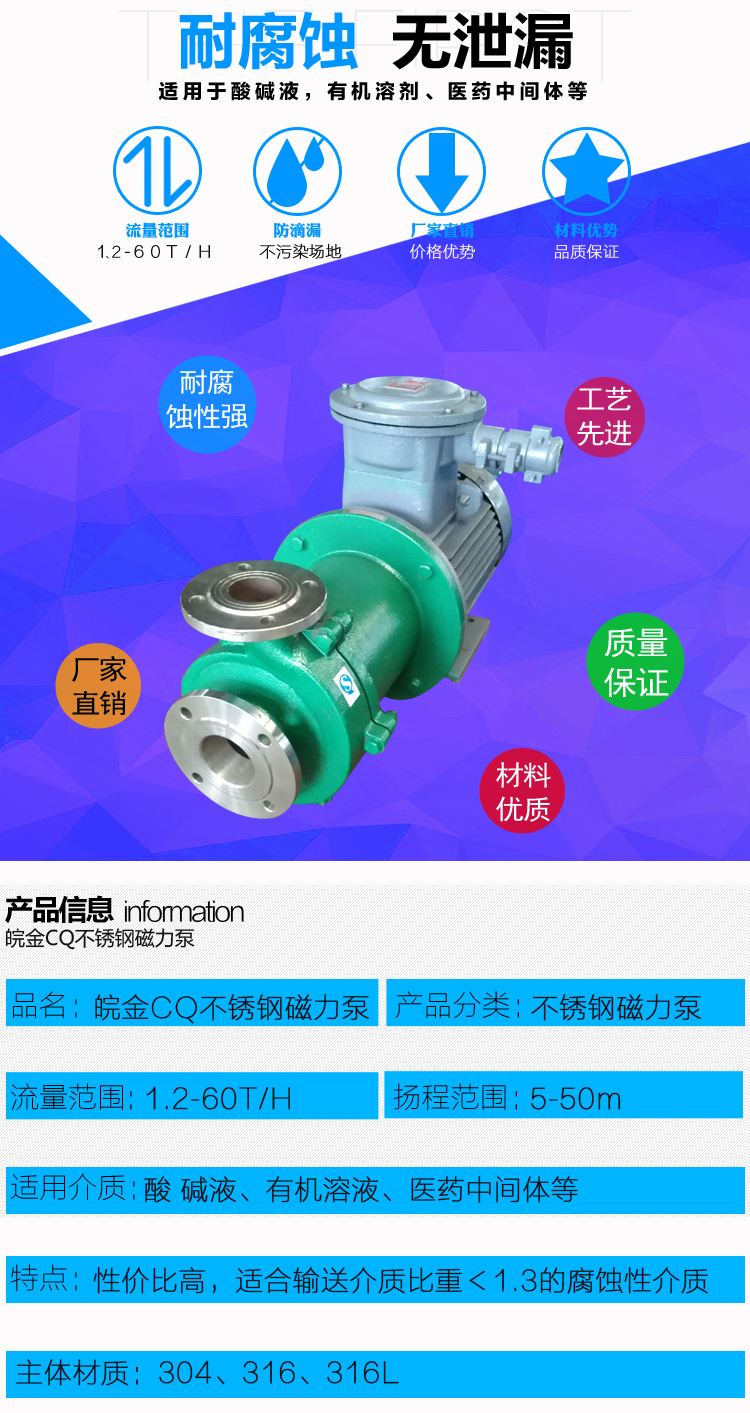 不銹鋼磁力泵又稱其為磁力離心泵、不銹鋼磁力驅動泵、耐腐蝕磁力化工泵,JCQ不銹鋼磁力泵是金屬磁力泵中的經典結構款型。