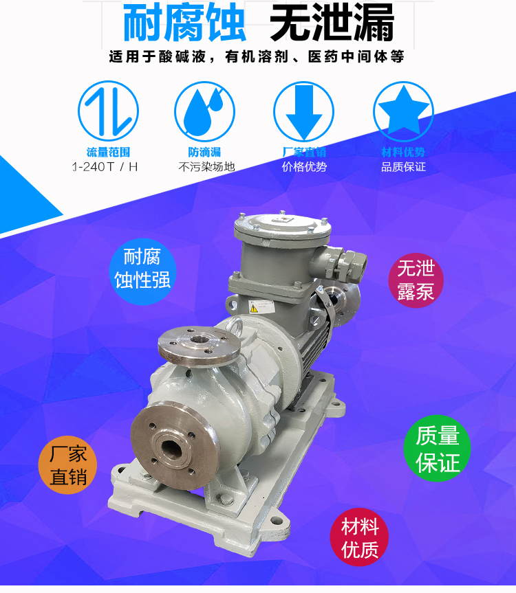 WJC不銹鋼磁力泵過流部件采用全不銹鋼材料(304、316、316L),內(nèi)、外磁轉(zhuǎn)子選用高磁能積、高矯頑力的稀土永磁制造,具有高效節(jié)能、介質(zhì)適用面廣、耐高溫、磁性強、不退磁等優(yōu)點,對有機酸,有機化合物,堿,中性溶液和各種氣體都有良好的耐蝕性,雙螺旋糟碳石墨軸承和硬質(zhì)合金軸套,具有較強的耐磨性,是應(yīng)用磁力耦合實現(xiàn)無接觸傳動、無動密封的新型高品質(zhì)磁力化工泵。保證了產(chǎn)品的壽命,是無泄漏輸送腐蝕性介質(zhì)的理想用泵。