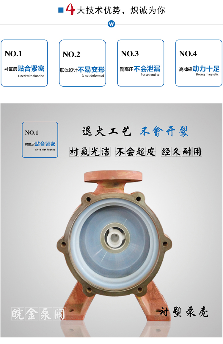氟塑料磁力泵又稱其為氟塑料磁力離心泵、襯四氟磁力泵、氟塑料磁力驅動泵、耐腐蝕磁力化工泵,CQB-FJ襯氟磁力泵是我公司氟塑料磁力泵中的全新升級款型,產品性能好,運轉更加穩定,材質更好,全封閉無泄露,適合現代化的環保要求。