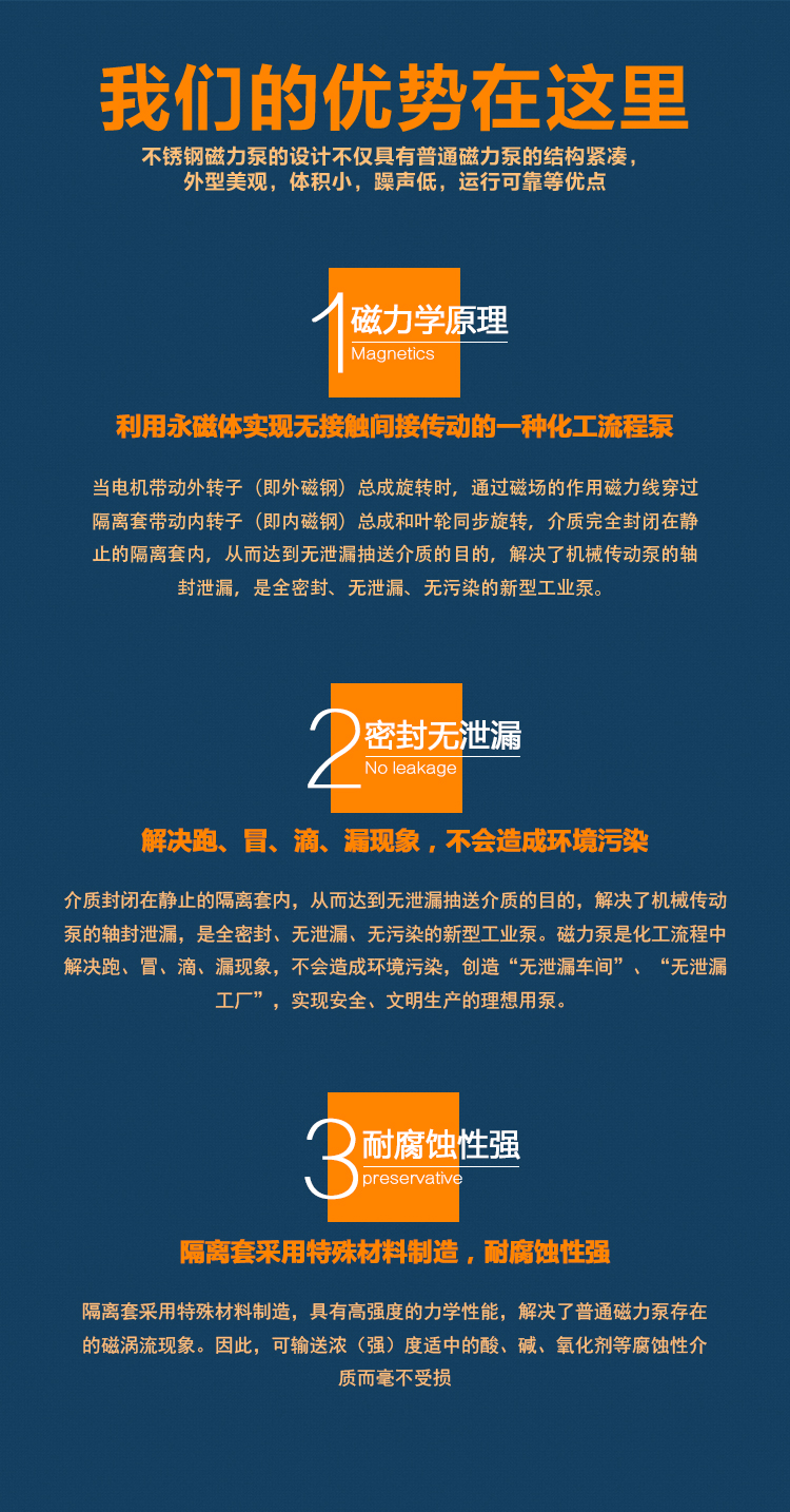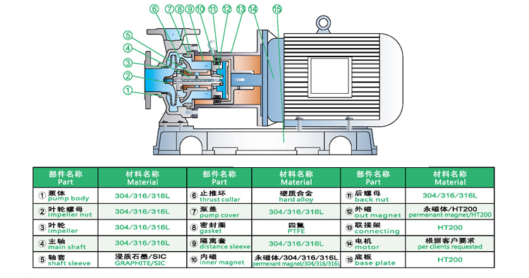 WJC不銹鋼磁力泵過流部件采用全不銹鋼材料(304、316、316L),內(nèi)、外磁轉(zhuǎn)子選用高磁能積、高矯頑力的稀土永磁制造,具有高效節(jié)能、介質(zhì)適用面廣、耐高溫、磁性強(qiáng)、不退磁等優(yōu)點(diǎn),對有機(jī)酸,有機(jī)化合物,堿,中性溶液和各種氣體都有良好的耐蝕性,雙螺旋糟碳石墨軸承和硬質(zhì)合金軸套,具有較強(qiáng)的耐磨性,是應(yīng)用磁力耦合實(shí)現(xiàn)無接觸傳動(dòng)、無動(dòng)密封的新型高品質(zhì)磁力化工泵。保證了產(chǎn)品的壽命,是無泄漏輸送腐蝕性介質(zhì)的理想用泵。