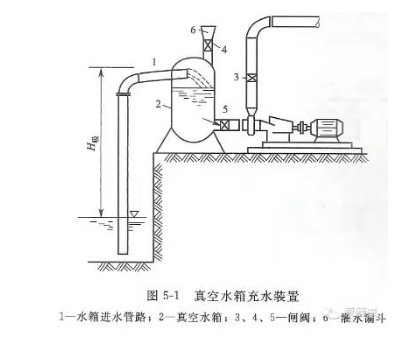 用水泵真空引水裝置充水時,先打開閘閥3、4、5,從漏斗6向水箱2中灌水至水箱進(jìn)水管路下緣齊平后,關(guān)閉閘閥3和4,即可啟動水泵。水泵啟動后,打開閘閥3,水箱中水位下降,齊平后,關(guān)閉閘閥3和4,即可啟動水泵。水泵啟動后,打開閘閥3上部形成一定的真空值,進(jìn)水池中的水沿水箱進(jìn)水管路不斷進(jìn)入水箱過程。
